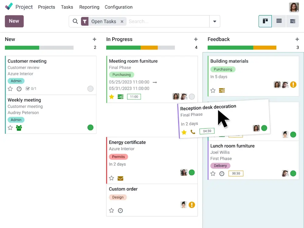 La vista Kanban de Odoo te permite organizar tus tareas por etapas de manera visual. Con un simple arrastrar y soltar, puedes mover tareas entre columnas, facilitando el seguimiento del progreso y la identificación de cuellos de botella.