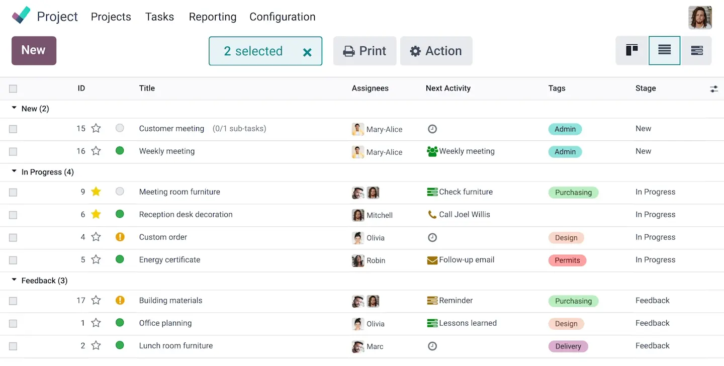 Odoo fomenta la colaboración efectiva entre equipos y clientes. Puedes asignar tareas a miembros específicos, establecer permisos de acceso y mantener una comunicación fluida a través de comentarios y notificaciones. Todo desde una interfaz sencilla y centralizada.