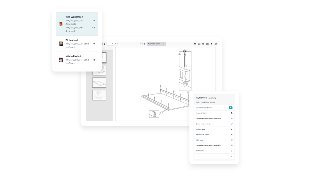 La app Taller de Odoo permite digitalizar tu línea de producción. En una tablet o dispositivo, puedes organizar: